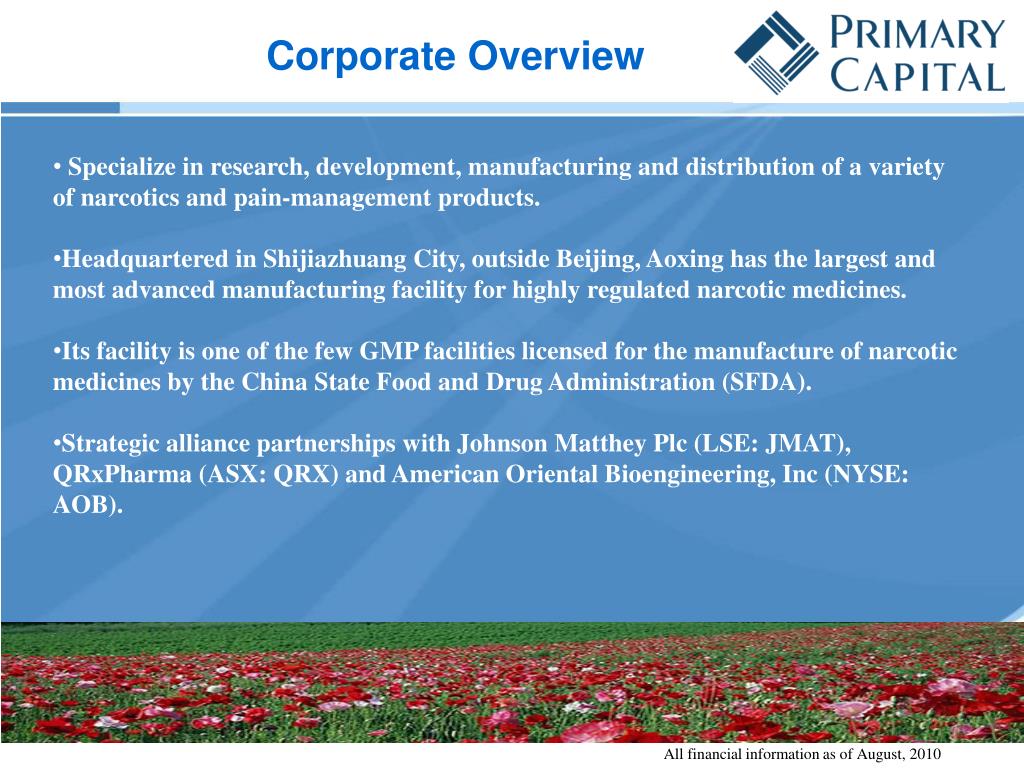 Corporate Overview • Specialize in research, development, manufacturing and distribution of a variety of narcotics and pain-management products. • Headquartered in Shijiazhuang City, outside Beijing, Aoxing has the largest and most advanced manufacturing facility for highly regulated narcotic medicines. • Its facility is one of the few GMP facilities licensed for the manufacture of narcotic medicines by the China State Food and Drug Administration (SFDA). • Strategic alliance partnerships with Johnson Matthey Plc (LSE: JMAT), QRxPharma (ASX: QRX) and American Oriental Bioengineering, Inc (NYSE: AOB). All financial information as of August, 2010