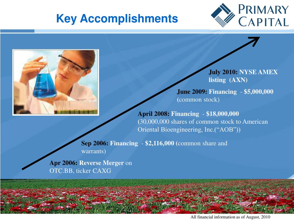 Key Accomplishments July 2010:NYSE AMEX listing (AXN) June 2009: Financing - $5,000,000 (common stock) April 2008: Financing - $18,000,000 (30,000,000 shares of common stock to American Oriental Bioengineering, Inc.(“AOB”)) Sep 2006:Financing - $2,116,000 (common share and warrants) Apr 2006:Reverse Merger on OTC.BB, ticker CAXG All financial information as of August, 2010