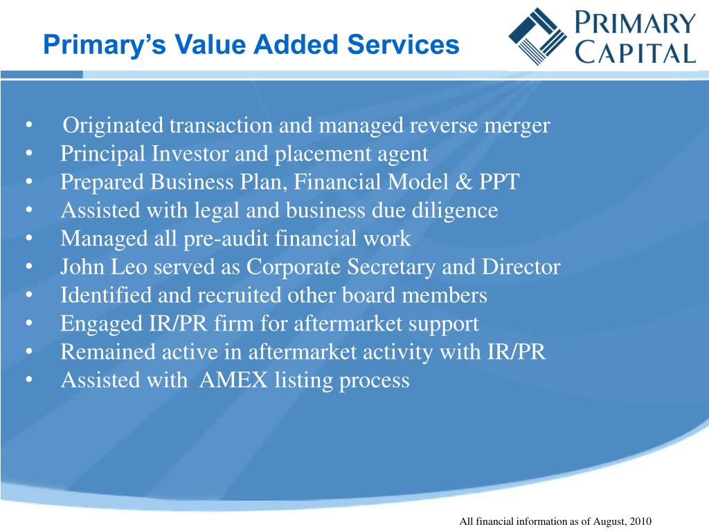 Primary’s Value Added Services • Originated transaction and managed reverse merger • Principal Investor and placement agent • Prepared Business Plan, Financial Model & PPT • Assisted with legal and business due diligence • Managed all pre-audit financial work • John Leo served as Corporate Secretary and Director • Identified and recruited other board members • Engaged IR/PR firm for aftermarket support • Remained active in aftermarket activity with IR/PR • Assisted with AMEX listing process All financial information as of August, 2010