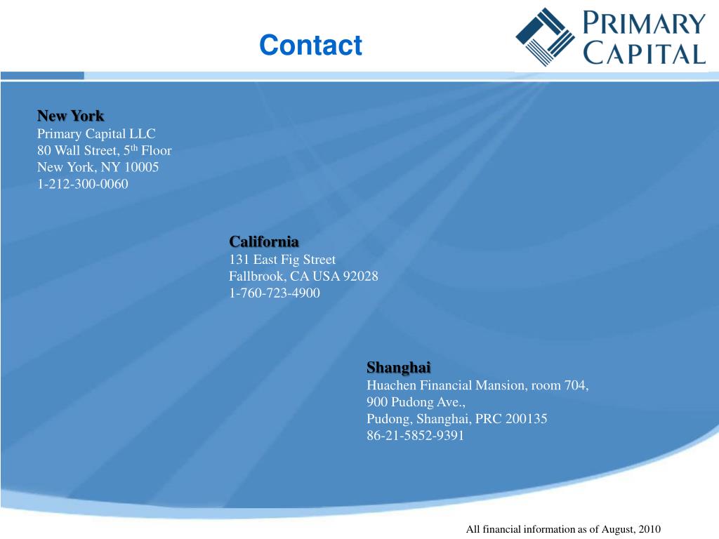 Contact New York Primary Capital LLC 80 Wall Street, 5thFloor New York, NY 10005 1-212-300-0060 California 131 East Fig Street Fallbrook, CA USA 92028 1-760-723-4900 Shanghai Huachen Financial Mansion, room 704, 900 Pudong Ave., Pudong, Shanghai, PRC 200135 86-21-5852-9391 All financial information as of August, 2010