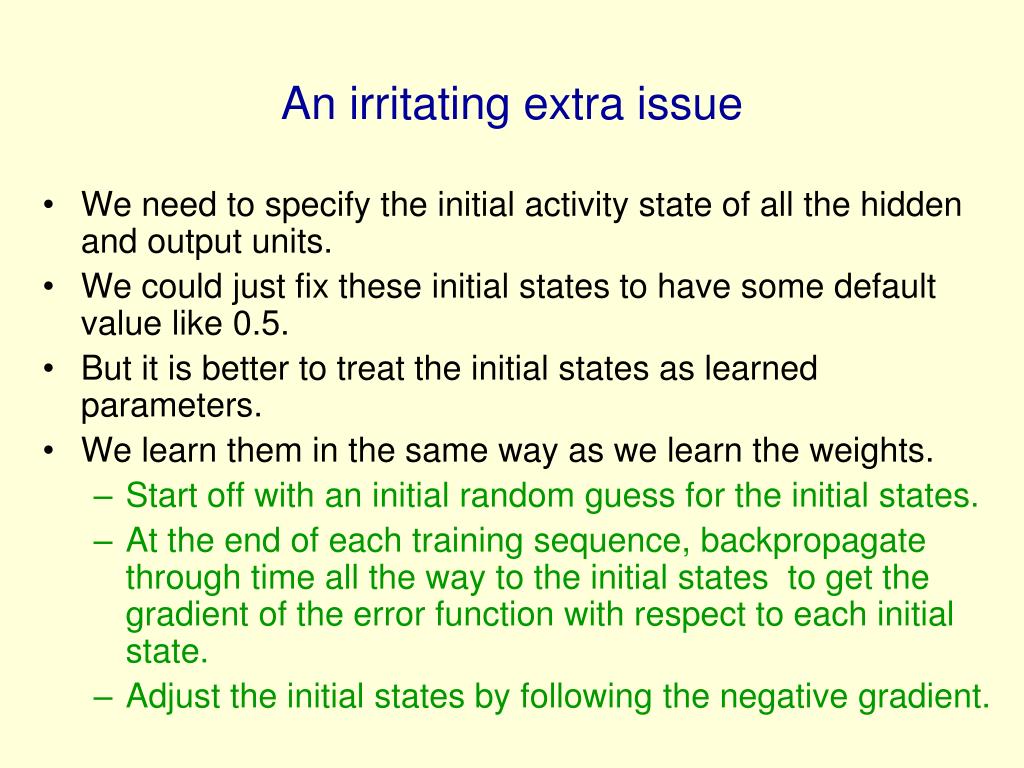 An irritating extra issue • We need to specify the initial activity state of all the hidden and output units. • We could just fix these initial states to have some default value like 0.5. • But it is better to treat the initial states as learned parameters. • We learn them in the same way as we learn the weights. • Start off with an initial random guess for the initial states. • At the end of each training sequence, backpropagate through time all the way to the initial states to get the gradient of the error function with respect to each initial state. • Adjust the initial states by following the negative gradient.