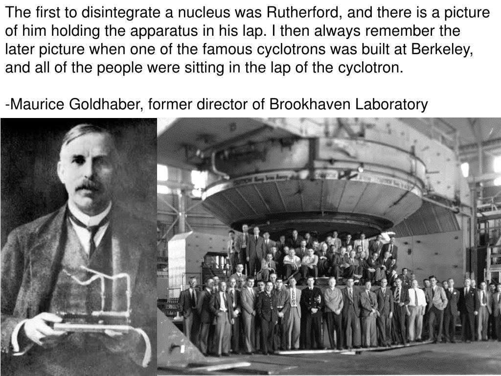 The first to disintegrate a nucleus was Rutherford, and there is a picture of him holding the apparatus in his lap. I then always remember the later picture when one of the famous cyclotrons was built at Berkeley, and all of the people were sitting in the lap of the cyclotron. -Maurice Goldhaber, former director of Brookhaven Laboratory