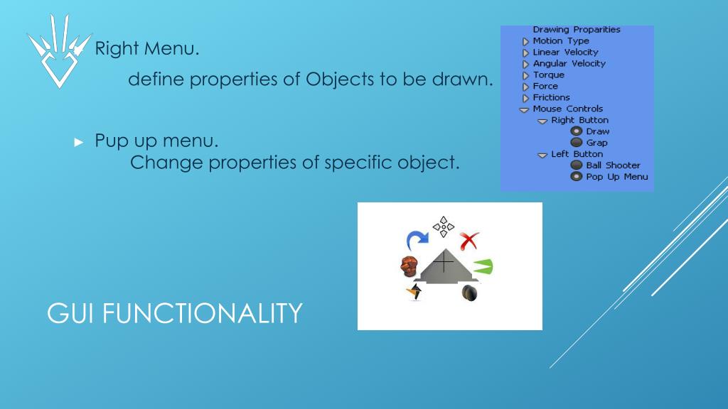 Right Menu. define properties of Objects to be drawn. • Pup up menu. Change properties of specific object. GUI Functionality