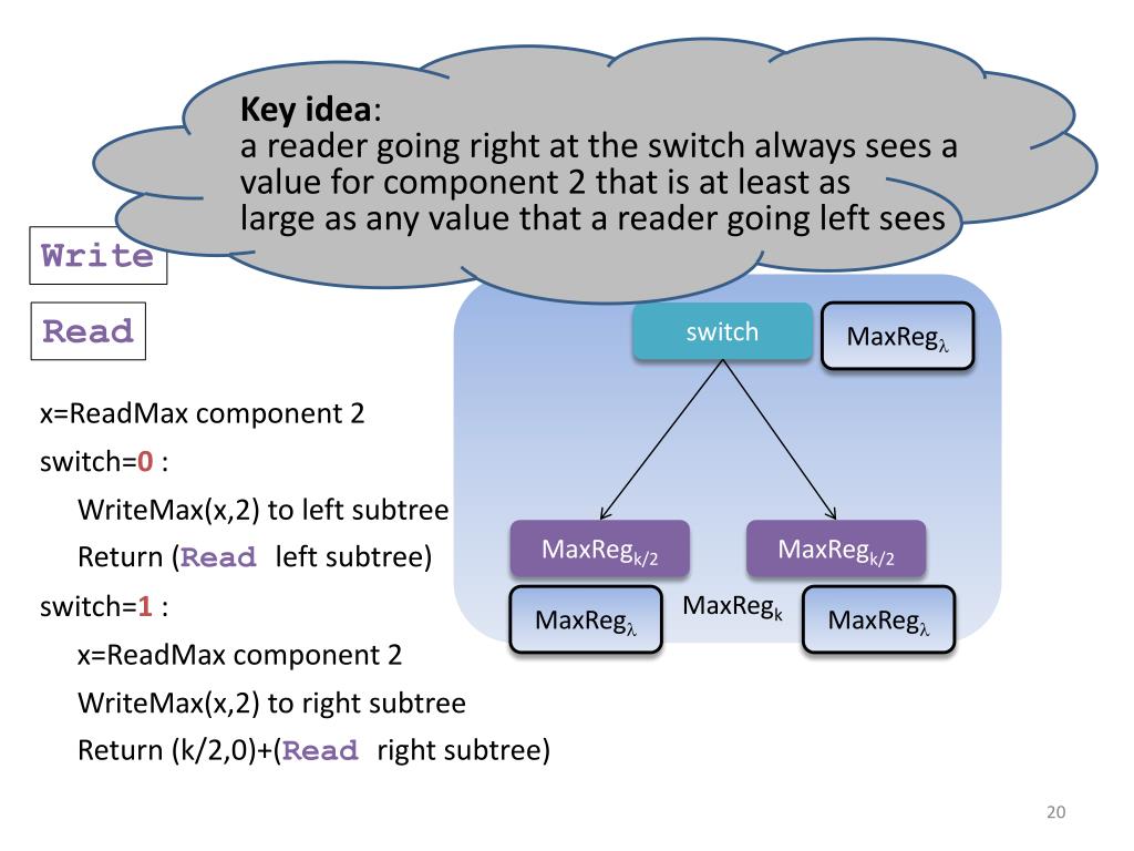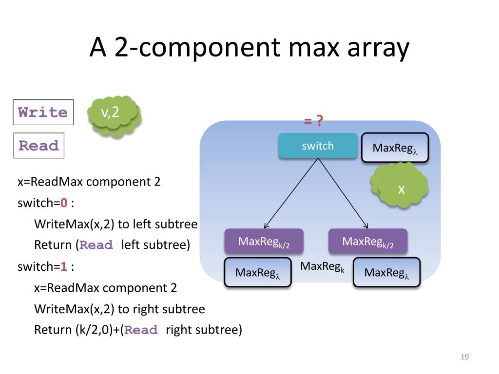 A 2-component max array v,2 Write v,1 = ? Read switch MaxRegl x x=ReadMax component 2 x switch=0 : WriteMax(x,2) to left subtree MaxRegk/2 MaxRegk/2 Return (Read left subtree) switch=1 : • MaxRegk MaxRegl MaxRegl x=ReadMax component 2 WriteMax(x,2) to right subtree Return (k/2,0)+(Read right subtree)