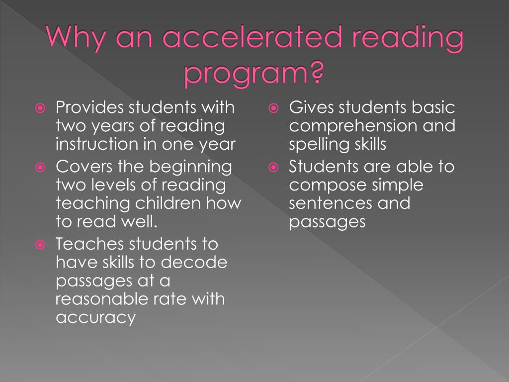 Why an accelerated reading program? • Provides students with two years of reading instruction in one year • Covers the beginning two levels of reading teaching children how to read well. • Teaches students to have skills to decode passages at a reasonable rate with accuracy • Gives students basic comprehension and spelling skills • Students are able to compose simple sentences and passages
