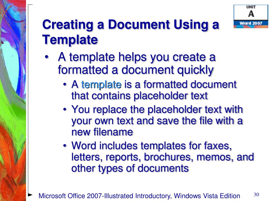 Creating a Document Using a Template • A template helps you create a formatted a document quickly • A template is a formatted document that contains placeholder text • You replace the placeholder text with your own text and save the file with a new filename • Word includes templates for faxes, letters, reports, brochures, memos, and other types of documents Microsoft Office 2007-Illustrated Introductory, Windows Vista Edition