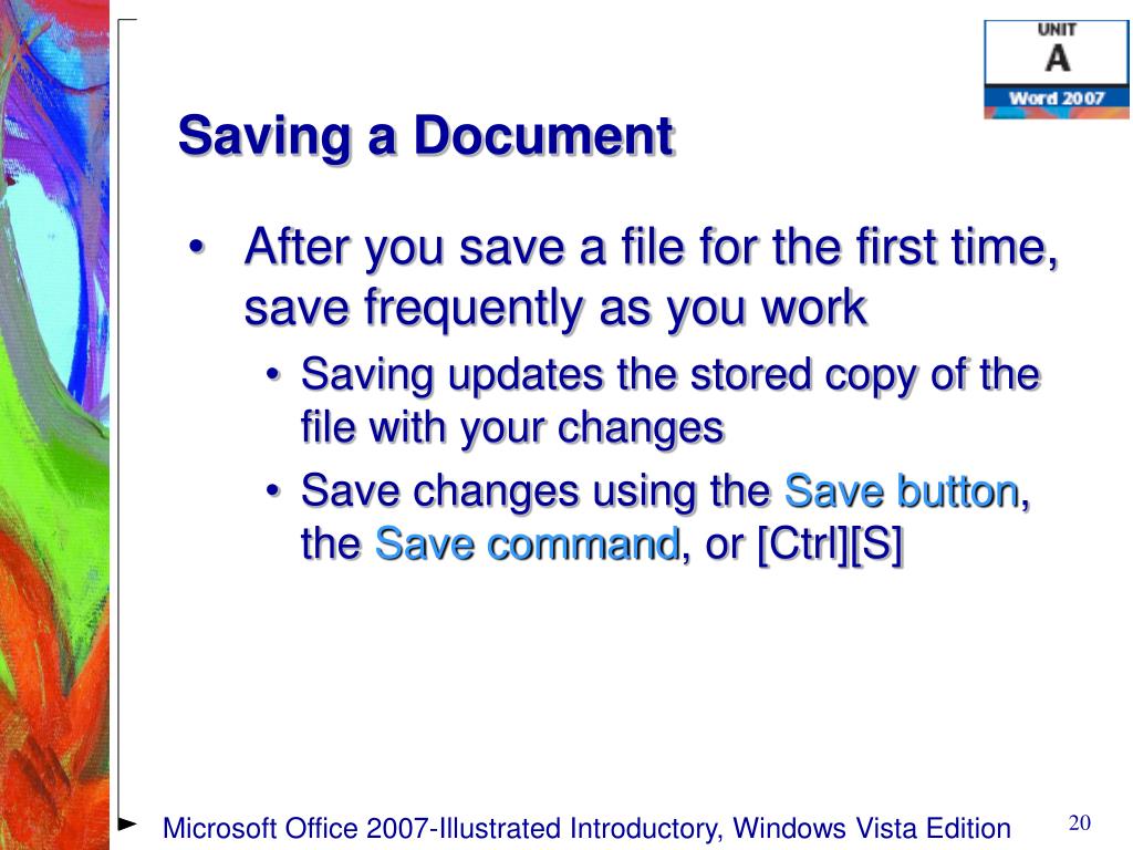 Saving a Document • After you save a file for the first time, save frequently as you work • Saving updates the stored copy of the file with your changes • Save changes using the Save button, the Save command, or [Ctrl][S] Microsoft Office 2007-Illustrated Introductory, Windows Vista Edition