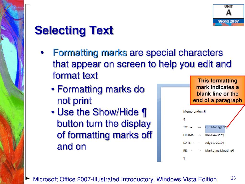 Selecting Text • Formatting marks are special characters that appear on screen to help you edit and format text This formatting mark indicates a blank line or the end of a paragraph • Formatting marks do not print • Use the Show/Hide ¶ button turn the display of formatting marks off and on Microsoft Office 2007-Illustrated Introductory, Windows Vista Edition