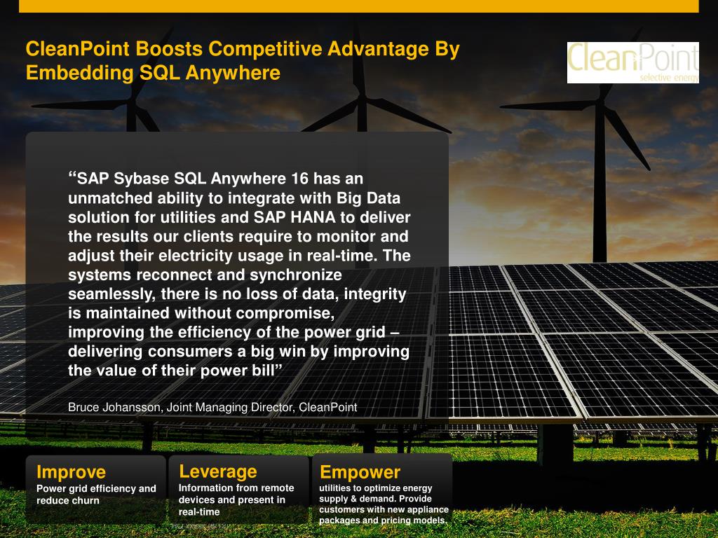 CleanPoint Boosts Competitive Advantage By Embedding SQL Anywhere “SAP Sybase SQL Anywhere 16 has an unmatched ability to integrate with Big Data solution for utilities and SAP HANA to deliver the results our clients require to monitor and adjust their electricity usage in real-time. The systems reconnect and synchronize seamlessly, there is no loss of data, integrity is maintained without compromise, improving the efficiency of the power grid – delivering consumers a big win by improving the value of their power bill” Bruce Johansson, Joint Managing Director, CleanPoint Leverage Information from remote devices and present in real-time Improve Power grid efficiency and reduce churn Empower utilities to optimize energy supply & demand. Provide customers with new appliance packages and pricing models. RQ xxxxx (8/12)