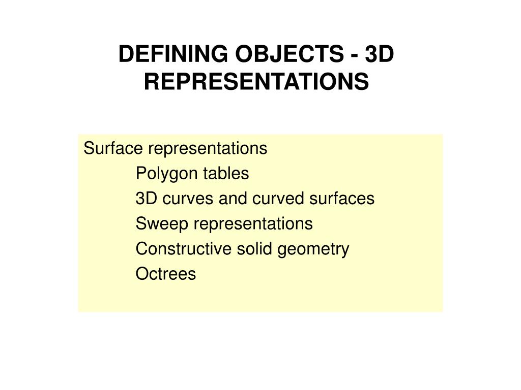 DEFINING OBJECTS - 3D REPRESENTATIONS Surface representations Polygon tables 3D curves and curved surfaces Sweep representations Constructive solid geometry Octrees