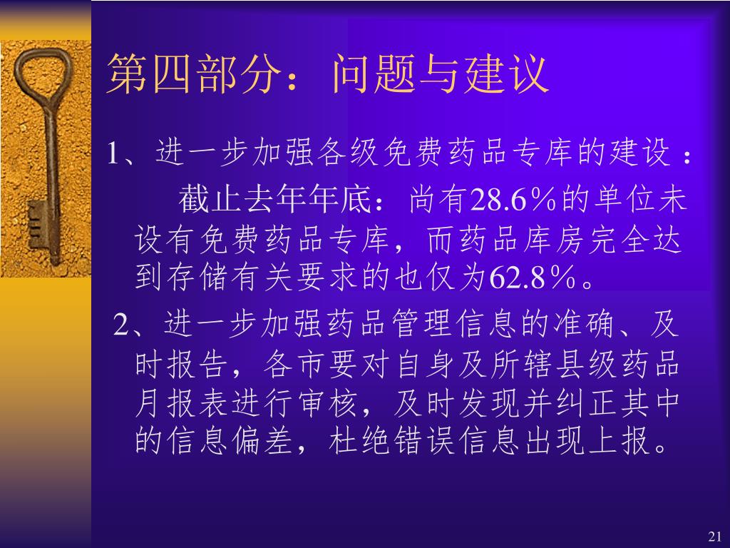 第四部分:问题与建议 1、进一步加强各级免费药品专库的建设 : 截止去年年底:尚有28.6%的单位未设有免费药品专库,而药品库房完全达到存储有关要求的也仅为62.8%。 2、进一步加强药品管理信息的准确、及时报告,各市要对自身及所辖县级药品月报表进行审核,及时发现并纠正其中的信息偏差,杜绝错误信息出现上报。