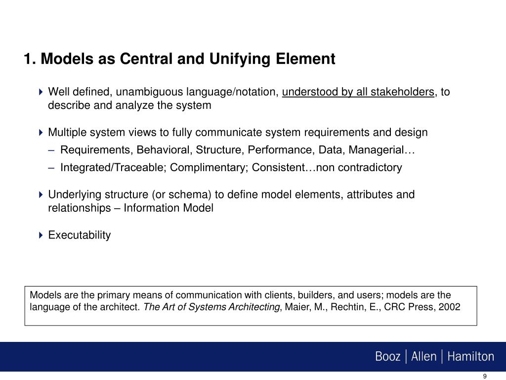 1. Models as Central and Unifying Element • Well defined, unambiguous language/notation, understood by all stakeholders, to describe and analyze the system • Multiple system views to fully communicate system requirements and design • Requirements, Behavioral, Structure, Performance, Data, Managerial… • Integrated/Traceable; Complimentary; Consistent…non contradictory • Underlying structure (or schema) to define model elements, attributes and relationships – Information Model • Executability Models are the primary means of communication with clients, builders, and users; models are the language of the architect. The Art of Systems Architecting, Maier, M., Rechtin, E., CRC Press, 2002