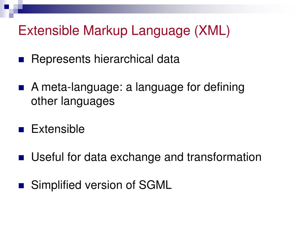 Extensible Markup Language (XML) • Represents hierarchical data • A meta-language: a language for defining other languages • Extensible • Useful for data exchange and transformation • Simplified version of SGML