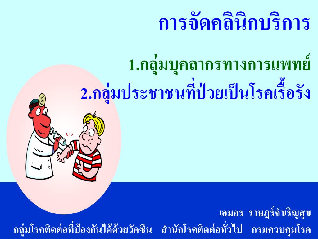 การจัดคลินิกบริการ 1.กลุ่มบุคลากรทางการแพทย์2.กลุ่มประชาชนที่ป่วยเป็นโรคเรื้อรัง เอมอร ราษฎร์จำเริญสุขกลุ่มโรคติดต่อที่ป้องกันได้ด้วยวัคซีน สำนักโรคติดต่อทั่วไป กรมควบคุมโรค
