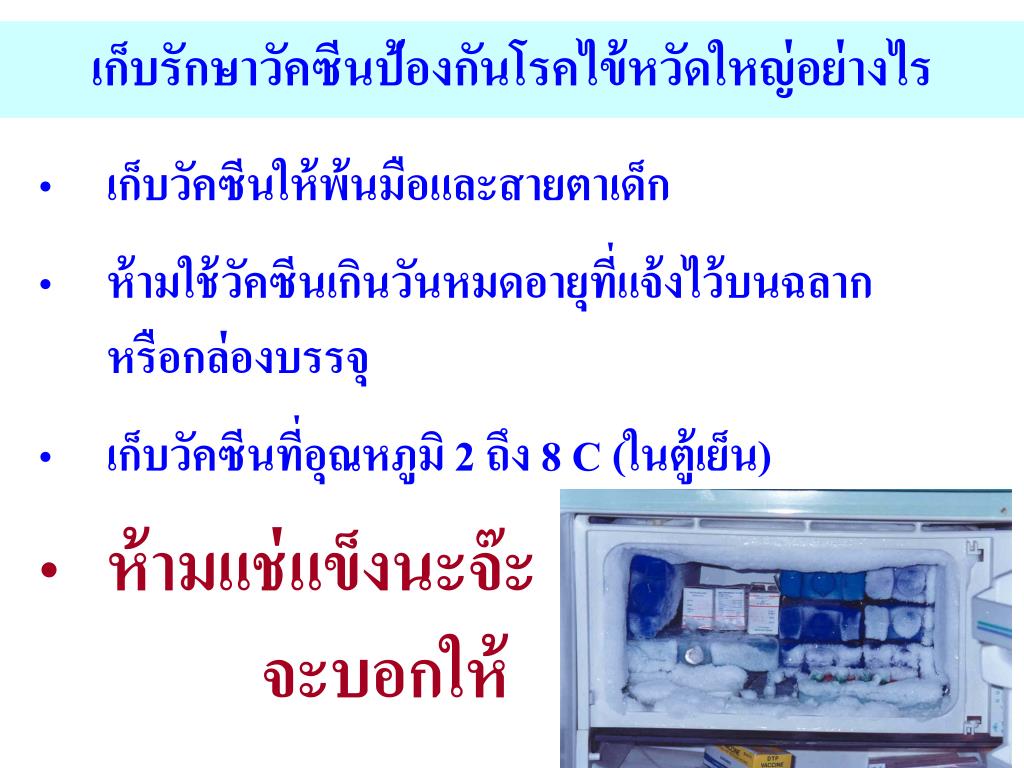 เก็บรักษาวัคซีนป้องกันโรคไข้หวัดใหญ่อย่างไรเก็บรักษาวัคซีนป้องกันโรคไข้หวัดใหญ่อย่างไร เก็บวัคซีนให้พ้นมือและสายตาเด็ก ห้ามใช้วัคซีนเกินวันหมดอายุที่แจ้งไว้บนฉลาก หรือกล่องบรรจุ เก็บวัคซีนที่อุณหภูมิ 2 ถึง 8 C (ในตู้เย็น) ห้ามแช่แข็งนะจ๊ะ จะบอกให้