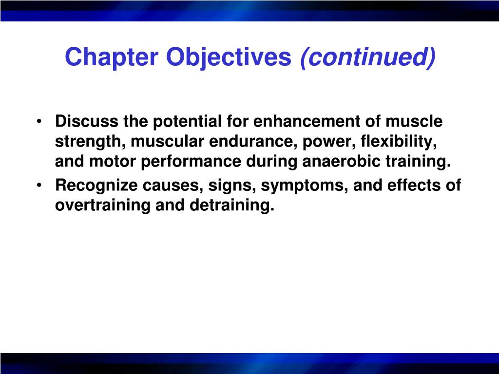 Chapter Objectives (continued) • Discuss the potential for enhancement of muscle strength, muscular endurance, power, flexibility, and motor performance during anaerobic training. • Recognize causes, signs, symptoms, and effects of overtraining and detraining.
