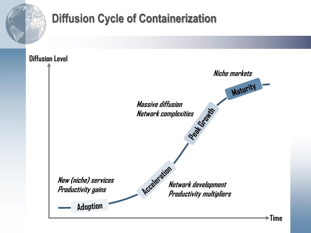 Diffusion Cycle of Containerization Diffusion Level Niche markets Maturity Massive diffusion Network complexities Peak Growth New (niche) services Productivity gains Acceleration Network development Productivity multipliers Adoption Time