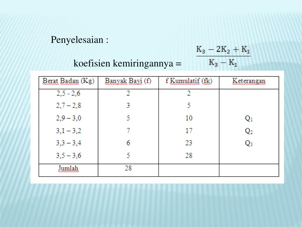 Contohsoal Misalkanberatbadanbayi (dicatatdalam Kg) yang barulahirdirumahsakitbersalin “Bunda” dapatdilihatdalamtabelberikut. Hitungkoefisienkemiringannyadenganmenggunakannilaikuartil