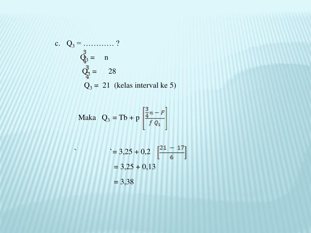 Q3 = ………… ? • Q3 = n • Q3 = 28 • Q3 = 21 (kelas interval ke 5) • Maka Q3 = Tb + p • ` `= 3,25 + 0,2 • = 3,25 + 0,13 • = 3,38