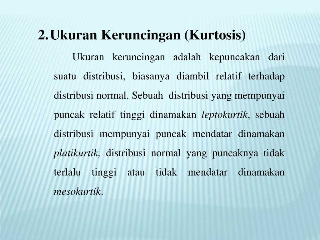 Untukmengetahuiapakahsekumpulan data mengikutidistribusileptokurtik, platikurtik, danmesokurtik, halinidapatdilihatberdasarkankoefisienkurtosisnya.