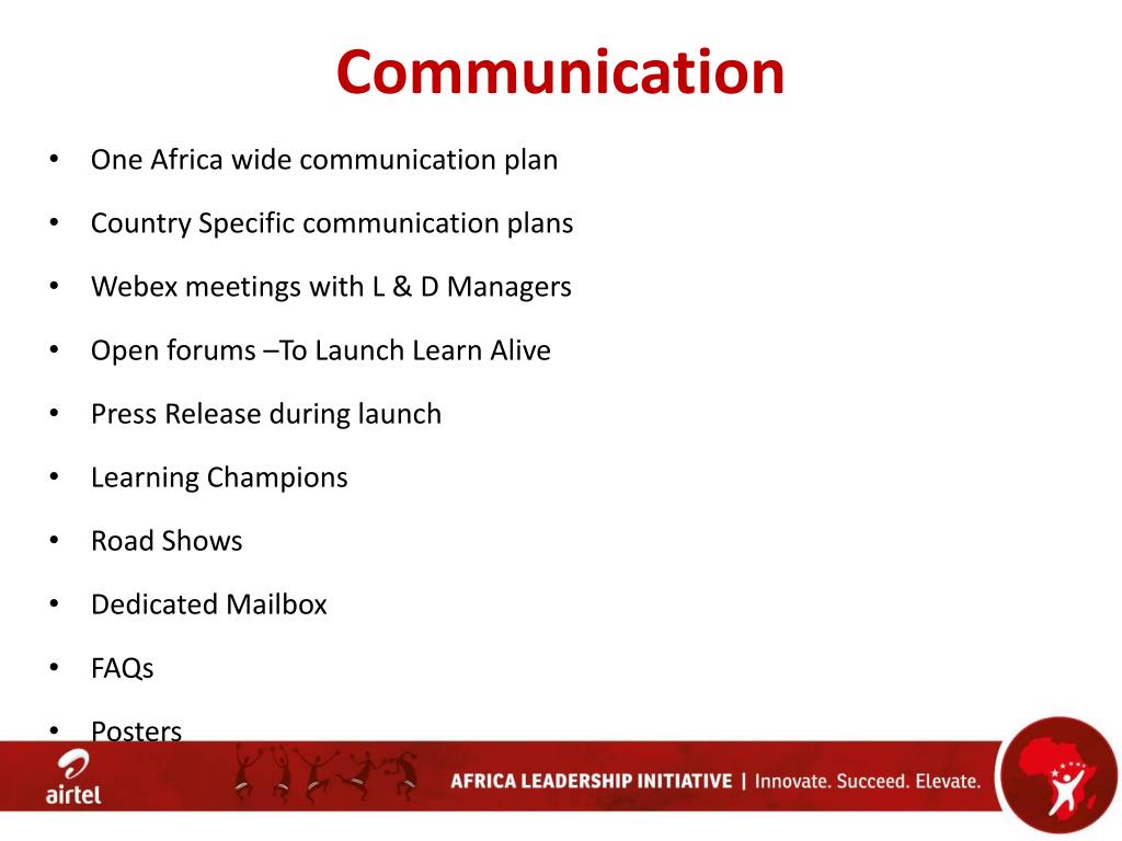 Communication • One Africa wide communication plan • Country Specific communication plans • Webex meetings with L & D Managers • Open forums –To Launch Learn Alive • Press Release during launch • Learning Champions • Road Shows • Dedicated Mailbox • FAQs • Posters