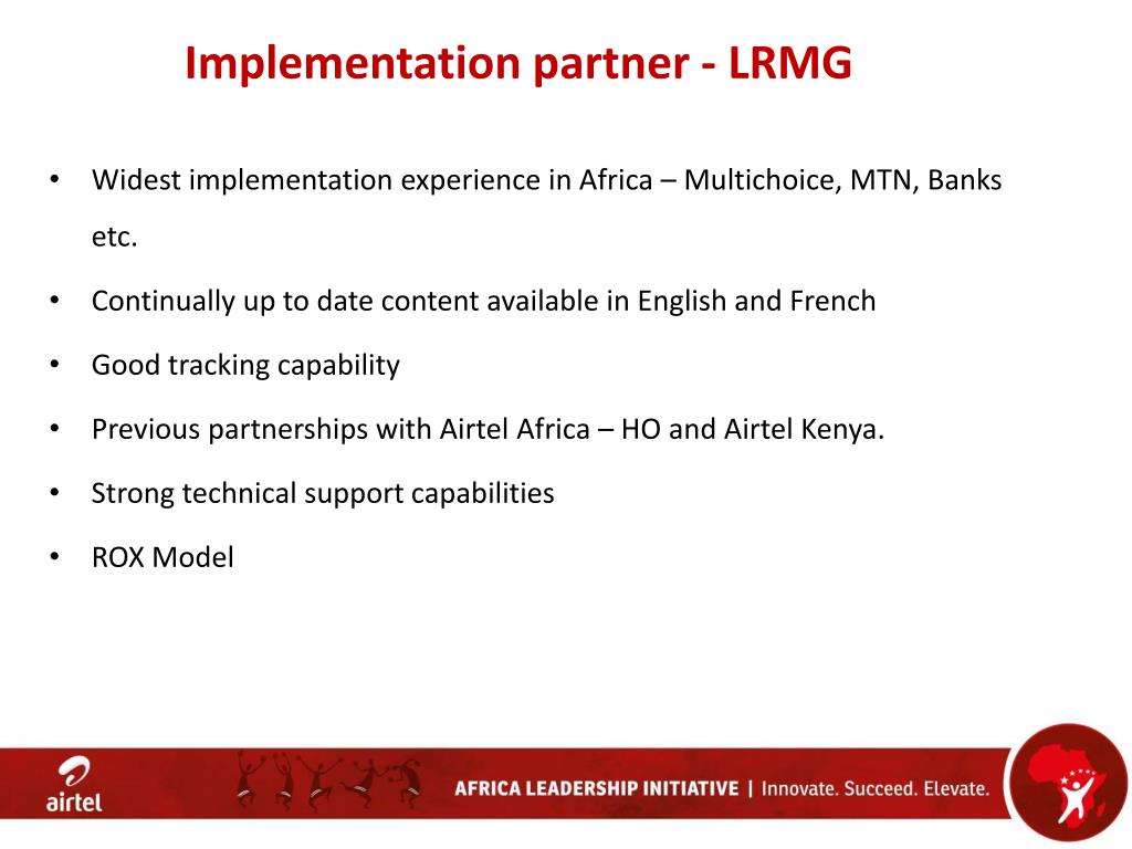 Implementation partner - LRMG • Widest implementation experience in Africa – Multichoice, MTN, Banks etc. • Continually up to date content available in English and French • Good tracking capability • Previous partnerships with Airtel Africa – HO and Airtel Kenya. • Strong technical support capabilities • ROX Model
