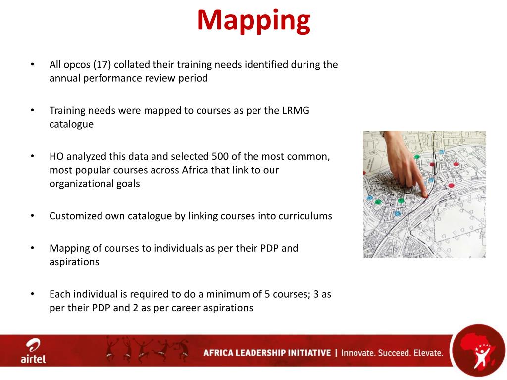 Mapping • All opcos (17) collated their training needs identified during the annual performance review period • Training needs were mapped to courses as per the LRMG catalogue • HO analyzed this data and selected 500 of the most common, most popular courses across Africa that link to our organizational goals • Customized own catalogue by linking courses into curriculums • Mapping of courses to individuals as per their PDP and aspirations • Each individual is required to do a minimum of 5 courses; 3 as per their PDP and 2 as per career aspirations