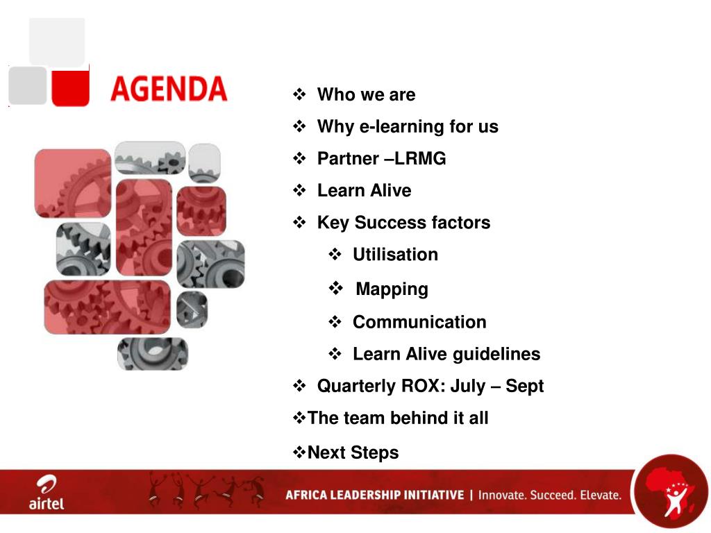Who we are • Why e-learning for us • Partner –LRMG • Learn Alive • Key Success factors • Utilisation • Mapping • Communication • Learn Alive guidelines • Quarterly ROX: July – Sept • The team behind it all • Next Steps