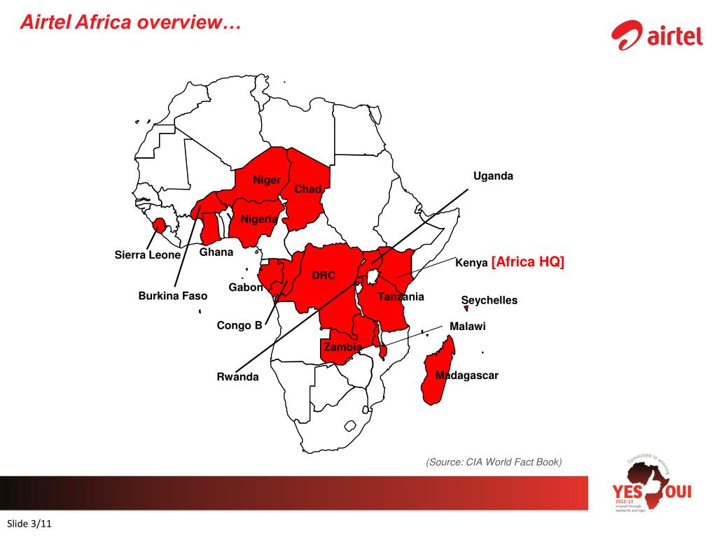Airtel Africa overview… Uganda Niger Chad Nigeria Y Ghana Sierra Leone Kenya [Africa HQ] DRC Gabon Burkina Faso Tanzania Seychelles Congo B Malawi Zambia Madagascar Rwanda (Source: CIA World Fact Book)