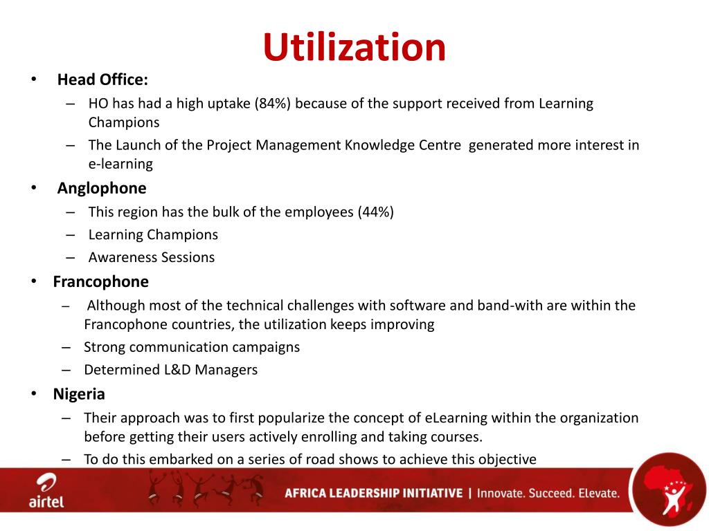 Utilization • Head Office: • HO has had a high uptake (84%) because of the support received from Learning Champions • The Launch of the Project Management Knowledge Centre generated more interest in e-learning • Anglophone • This region has the bulk of the employees (44%) • Learning Champions • Awareness Sessions • Francophone • Although most of the technical challenges with software and band-with are within the Francophone countries, the utilization keeps improving • Strong communication campaigns • Determined L&D Managers • Nigeria • Their approach was to first popularize the concept of eLearning within the organization before getting their users actively enrolling and taking courses. • To do this embarked on a series of road shows to achieve this objective