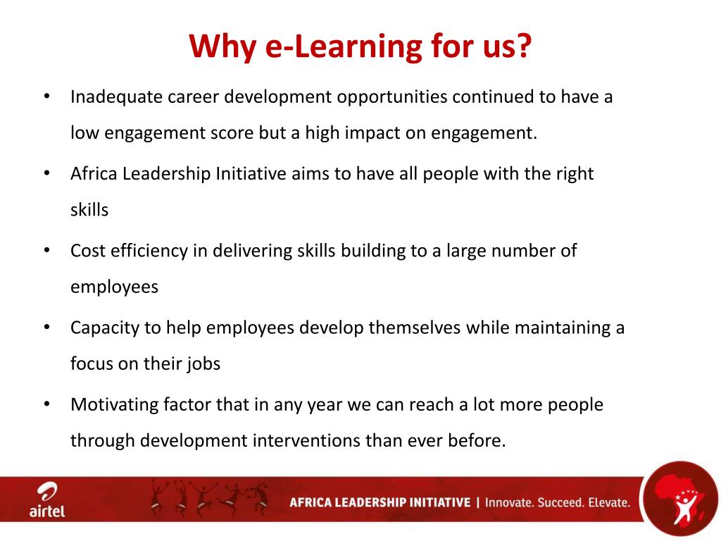 Why e-Learning for us? • Inadequate career development opportunities continued to have a low engagement score but a high impact on engagement. • Africa Leadership Initiative aims to have all people with the right skills • Cost efficiency in delivering skills building to a large number of employees • Capacity to help employees develop themselves while maintaining a focus on their jobs • Motivating factor that in any year we can reach a lot more people through development interventions than ever before.