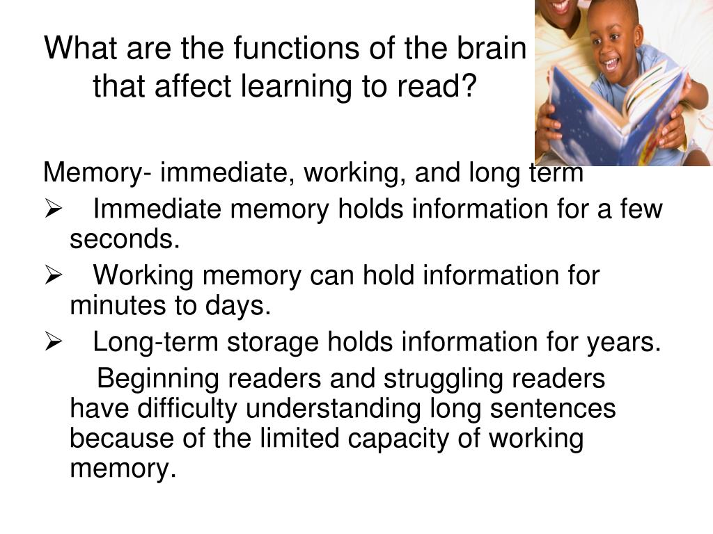 What are the functions of the brain that affect learning to read? Memory- immediate, working, and long term • Immediate memory holds information for a few seconds. • Working memory can hold information for minutes to days. • Long-term storage holds information for years. Beginning readers and struggling readers have difficulty understanding long sentences because of the limited capacity of working memory.