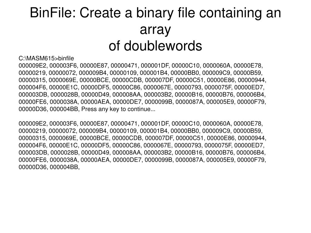 BinFile: Create a binary file containing an arrayof doublewords C:\MASM615>binfile 000009E2, 000003F6, 00000E87, 00000471, 000001DF, 00000C10, 0000060A, 00000E78, 00000219, 00000072, 000009B4, 00000109, 000001B4, 00000BB0, 000009C9, 00000B59, 00000315, 0000069E, 00000BCE, 00000CDB, 000007DF, 00000C51, 00000E86, 00000944, 000004F6, 00000E1C, 00000DF5, 00000C86, 0000067E, 00000793, 0000075F, 00000ED7, 000003DB, 0000028B, 00000D49, 000008AA, 000003B2, 00000B16, 00000B76, 000006B4, 00000FE6, 0000038A, 00000AEA, 00000DE7, 0000099B, 0000087A, 000005E9, 00000F79, 00000D36, 000004BB, Press any key to continue... 000009E2, 000003F6, 00000E87, 00000471, 000001DF, 00000C10, 0000060A, 00000E78, 00000219, 00000072, 000009B4, 00000109, 000001B4, 00000BB0, 000009C9, 00000B59, 00000315, 0000069E, 00000BCE, 00000CDB, 000007DF, 00000C51, 00000E86, 00000944, 000004F6, 00000E1C, 00000DF5, 00000C86, 0000067E, 00000793, 0000075F, 00000ED7, 000003DB, 0000028B, 00000D49, 000008AA, 000003B2, 00000B16, 00000B76, 000006B4, 00000FE6, 0000038A, 00000AEA, 00000DE7, 0000099B, 0000087A, 000005E9, 00000F79, 00000D36, 000004BB,