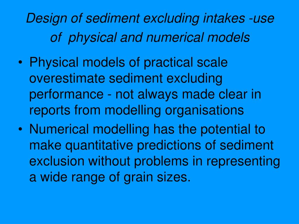 Design of sediment excluding intakes -use of physical and numerical models • Physical models of practical scale overestimate sediment excluding performance - not always made clear in reports from modelling organisations • Numerical modelling has the potential to make quantitative predictions of sediment exclusion without problems in representing a wide range of grain sizes.