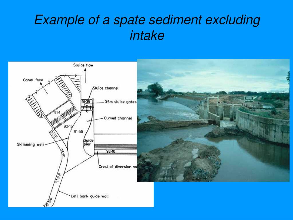 Limitations of sediment excluding intakes in spate schemes • Spate intakes divert all the wadi flows except for the short periods, sometimes only minutes, during flood peaks when wadi flows exceed the intake capacity. Sediment exclusion only effective during these periods. • Sluice gates have to be operated in response to rapidly varying spate flows – mechanised gates desirable but not often affordable.