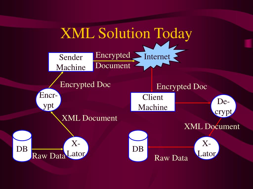 XML Solution Today Internet Encrypted Sender Machine Document Encrypted Doc Encrypted Doc Encr- ypt Client Machine De- crypt XML Document XML Document DB DB X- Lator X- Lator Raw Data Raw Data