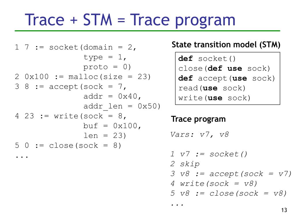 State transition model (STM) def socket() close(def use sock) def accept(use sock) read(use sock) write(use sock) Trace + STM = Trace program 1 7 := socket(domain = 2, type = 1, proto = 0) 2 0x100 := malloc(size = 23) 3 8 := accept(sock = 7, addr = 0x40, addr_len = 0x50) 4 23 := write(sock = 8, buf = 0x100, len = 23) 5 0 := close(sock = 8) ... Trace program Vars: v7, v8 1 v7 := socket() 2 skip 3 v8 := accept(sock = v7) 4 write(sock = v8) 5 v8 := close(sock = v8) ...