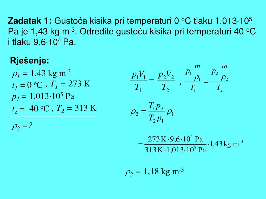 Zadatak 1: Gustoća kisika pri temperaturi 0 oC tlaku 1,013105 Pa je 1,43 kg m-3. Odredite gustoću kisika pri temperaturi 40 oC i tlaku 9,6104 Pa. Rješenje: 1 = 1,43 kg m-3 , , T1 = 273 K t1 =0 oC p1 = 1,013105 Pa , T2 = 313 K t2 = 40 oC 2 =? 2 = 1,18 kg m-3