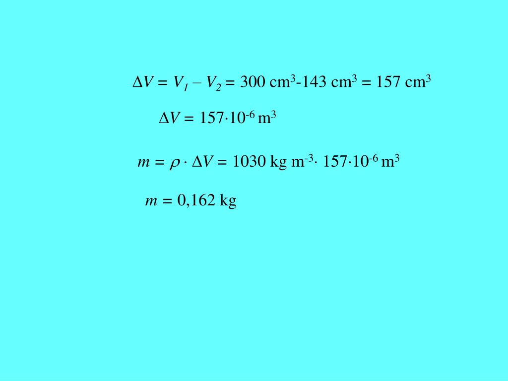 V = V1 – V2 = 300 cm3-143 cm3 = 157 cm3 V = 15710-6 m3 m = V = 1030 kg m-3 15710-6 m3 m = 0,162 kg