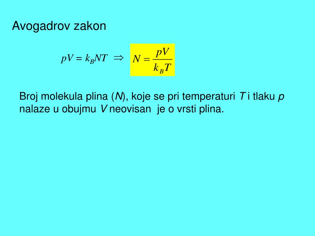 Avogadrov zakon pV = kBNT Broj molekula plina (N), koje se pri temperaturi T i tlaku p nalaze u obujmu V neovisan je o vrsti plina.