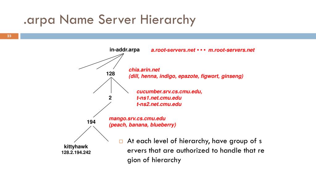 .arpa Name Server Hierarchy • At each level of hierarchy, have group of servers that are authorized to handle that region of hierarchy in-addr.arpa a.root-servers.net • • • m.root-servers.net chia.arin.net (dill, henna, indigo, epazote, figwort, ginseng) 128 cucumber.srv.cs.cmu.edu, t-ns1.net.cmu.edu t-ns2.net.cmu.edu 2 mango.srv.cs.cmu.edu (peach, banana, blueberry) 194 kittyhawk 128.2.194.242