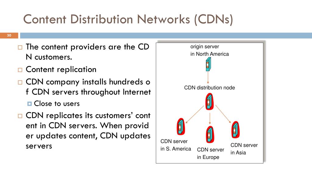 Content Distribution Networks (CDNs) • The content providers are the CDN customers. • Content replication • CDN company installs hundreds of CDN servers throughout Internet • Close to users • CDN replicates its customers’ content in CDN servers. When provider updates content, CDN updates servers origin server in North America CDN distribution node CDN server in S. America CDN server in Asia CDN server in Europe