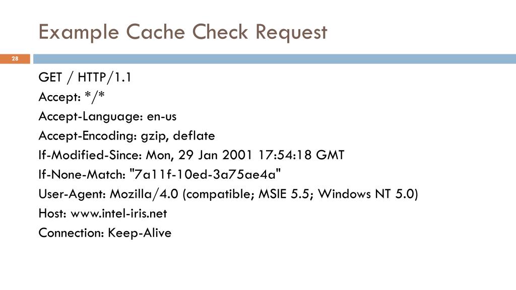 Example Cache Check Request GET / HTTP/1.1 Accept: */* Accept-Language: en-us Accept-Encoding: gzip, deflate If-Modified-Since: Mon, 29 Jan 2001 17:54:18 GMT If-None-Match: "7a11f-10ed-3a75ae4a" User-Agent: Mozilla/4.0 (compatible; MSIE 5.5; Windows NT 5.0) Host: www.intel-iris.net Connection: Keep-Alive