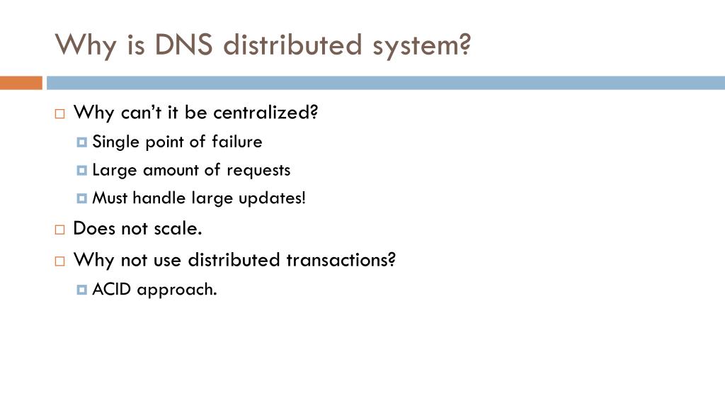 Why is DNS distributed system? • Why can’t it be centralized? • Single point of failure • Large amount of requests • Must handle large updates! • Does not scale. • Why not use distributed transactions? • ACID approach.