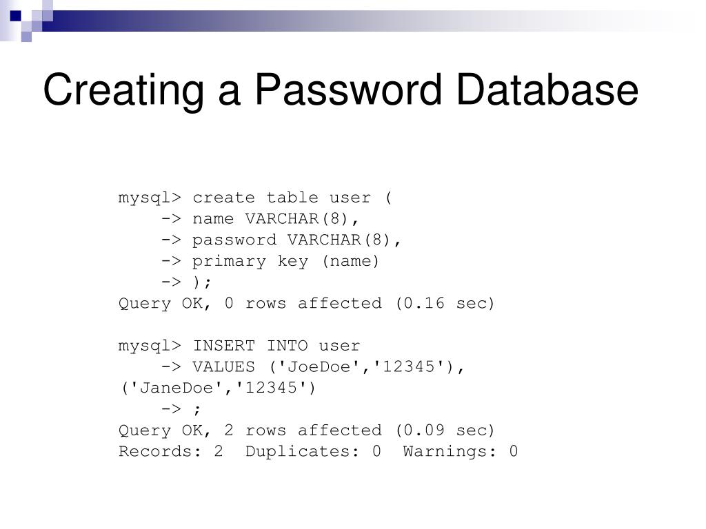 Creating a Password Database mysql> create table user ( -> name VARCHAR(8), -> password VARCHAR(8), -> primary key (name) -> ); Query OK, 0 rows affected (0.16 sec) mysql> INSERT INTO user -> VALUES ('JoeDoe','12345'), ('JaneDoe','12345') -> ; Query OK, 2 rows affected (0.09 sec) Records: 2 Duplicates: 0 Warnings: 0