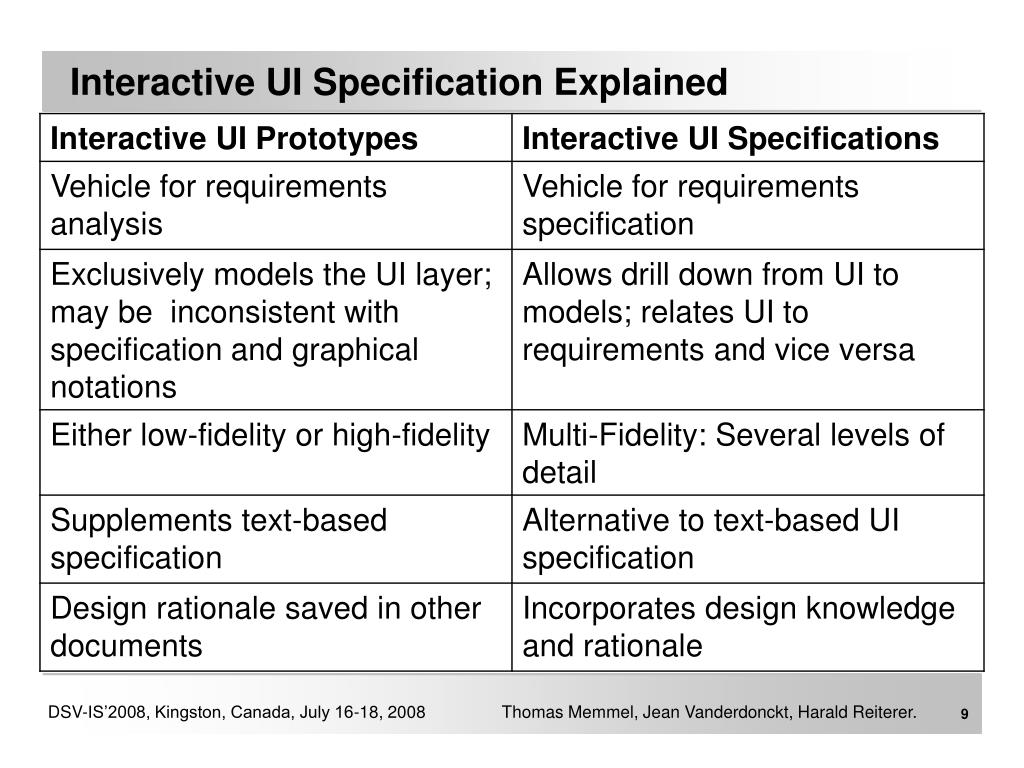 Multi-Fidelity User Interface Specifications Thomas Memmel1, Jean Vanderdonckt2, Harald Reiterer1 1Human-Computer Interaction Group, University of Konstanz, Universitätsstrasse 10, 78457 Konstanz, Germanyhttp://hci.uni-konstanz.de 2Université catholique de Louvain (UCL) Louvain School of Management (LSM) - Information Systems Unit (ISYS) Belgian Laboratory of Computer-Human Interaction (BCHI) http://www.isys.ucl.ac.be/bchi