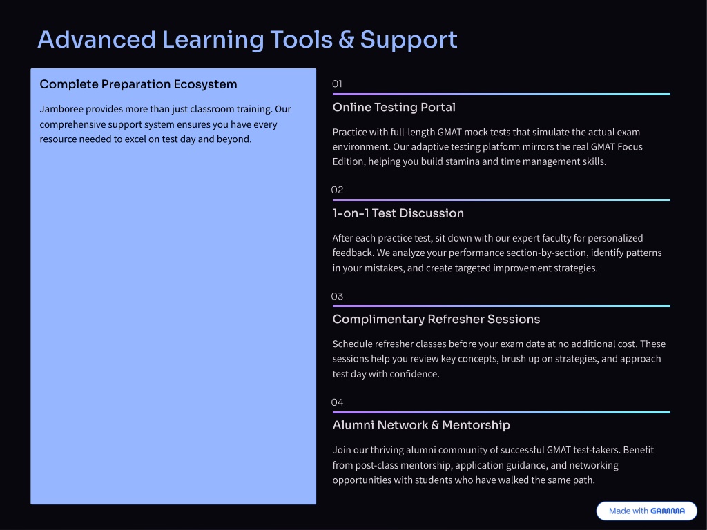 Advanced Learning Tools & Support Complete Preparation Ecosystem 01 Online Testing Portal Jamboree provides more than just classroom training. Our comprehensive support system ensures you have every resource needed to excel on test day and beyond. Practice with full-length GMAT mock tests that simulate the actual exam environment. Our adaptive testing platform mirrors the real GMAT Focus Edition, helping you build stamina and time management skills. 02 1-on-1 Test Discussion After each practice test, sit down with our expert faculty for personalized feedback. We analyze your performance section-by-section, identify patterns in your mistakes, and create targeted improvement strategies. 03 Complimentary Refresher Sessions Schedule refresher classes before your exam date at no additional cost. These sessions help you review key concepts, brush up on strategies, and approach test day with confidence. 04 Alumni Network & Mentorship Join our thriving alumni community of successful GMAT test-takers. Benefit from post-class mentorship, application guidance, and networking opportunities with students who have walked the same path.