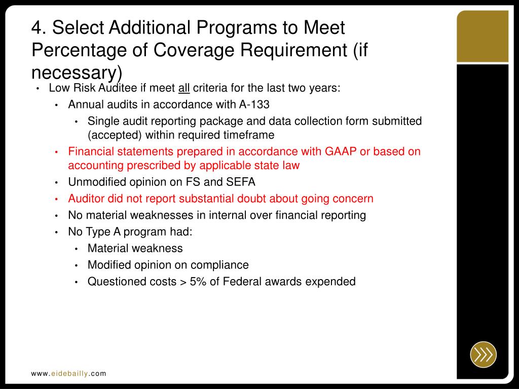 4. Select Additional Programs to Meet Percentage of Coverage Requirement (if necessary) • Low Risk Auditee if meet all criteria for the last two years: • Annual audits in accordance with A-133 • Single audit reporting package and data collection form submitted (accepted) within required timeframe • Financial statements prepared in accordance with GAAP or based on accounting prescribed by applicable state law • Unmodified opinion on FS and SEFA • Auditor did not report substantial doubt about going concern • No material weaknesses in internal over financial reporting • No Type A program had: • Material weakness • Modified opinion on compliance • Questioned costs > 5% of Federal awards expended