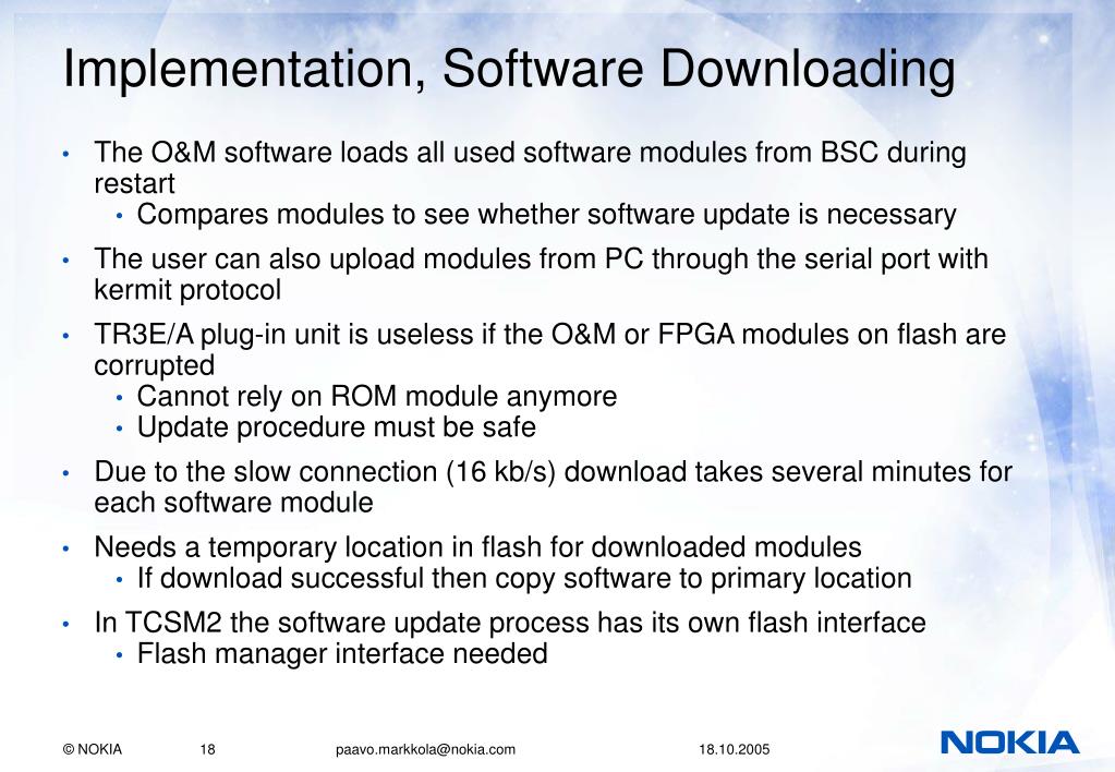 Implementation, Software Downloading • The O&M software loads all used software modules from BSC during restart • Compares modules to see whether software update is necessary • The user can also upload modules from PC through the serial port with kermit protocol • TR3E/A plug-in unit is useless if the O&M or FPGA modules on flash are corrupted • Cannot rely on ROM module anymore • Update procedure must be safe • Due to the slow connection (16 kb/s) download takes several minutes for each software module • Needs a temporary location in flash for downloaded modules • If download successful then copy software to primary location • In TCSM2 the software update process has its own flash interface • Flash manager interface needed