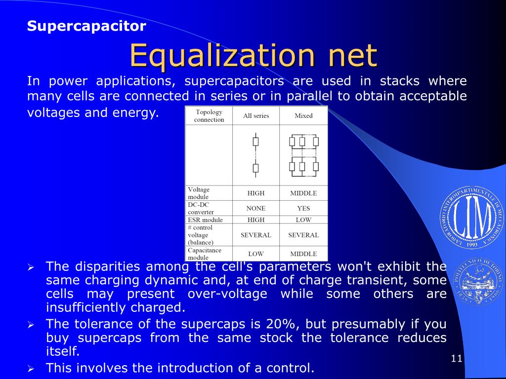 Supercapacitor Equalization net In power applications, supercapacitors are used in stacks where many cells are connected in series or in parallel to obtain acceptable voltages and energy. • The disparities among the cell's parameters won't exhibit the same charging dynamic and, at end of charge transient, some cells may present over-voltage while some others are insufficiently charged. • The tolerance of the supercaps is 20%, but presumably if you buy supercaps from the same stock the tolerance reduces itself. • This involves the introduction of a control.